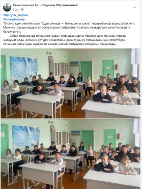 18 сәуір күні мектебімізде “Суды үнемде — болашақты сақта” тақырыбында ашық сабақ өтті. Мақскты-оқушылардың су ресурстарын пайдалануға саналы көзқарасын қалыптастыруға бағытталған.
