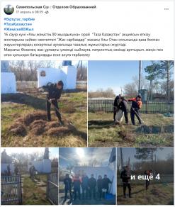 16 сәуір күні «Ұлы жеңістің 80 жылдығына» орай “Таза Қазақстан” акциясын өткізу жоспарына сәйкес мектептегі “Жас сарбаздар” жасағы Ұлы Отан соғысында қаза бооған жауынгерлердің ескерткіші аумағында тазалық жұмыстарын жүргізді.