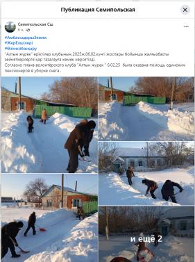 Согласно плана волонтёрского клуба "Алтын жүрек " 6.02.25 была оказана помощь одиноким пенсионеров в уборке снега .