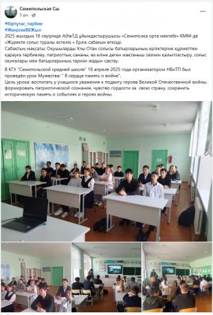 В КГУ "Семипольской средней школе" 18 апреля 2025 года организатором НВиТП был проведён урок Мужества: " В сердце память о войне".