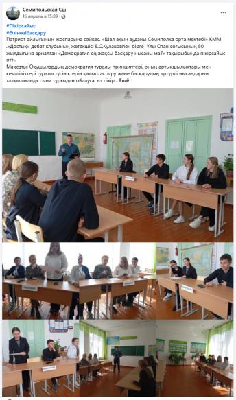 Согласно плана месячника Патриот . В КГУ "Семипольская средняя школа района Шал акына" . Совместно с руководителем дебатного клуба "Достық" Кулаковым Е.С. были проведены дебаты посвященные 80-летию ВОВ на тему: "Демократия лучшая форма правления?"